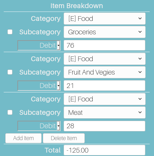 If you are budgeting or just want to know how much you spend on food vs household items, you might have a category for each. You may even break Food into subcategories such as Meat and Groceries. You probably don’t want to bother creating a separate transaction for each, especially if you used a card to make your purchase, so you can separate your purchase into Items (each item with its own Category) under the one Transaction.