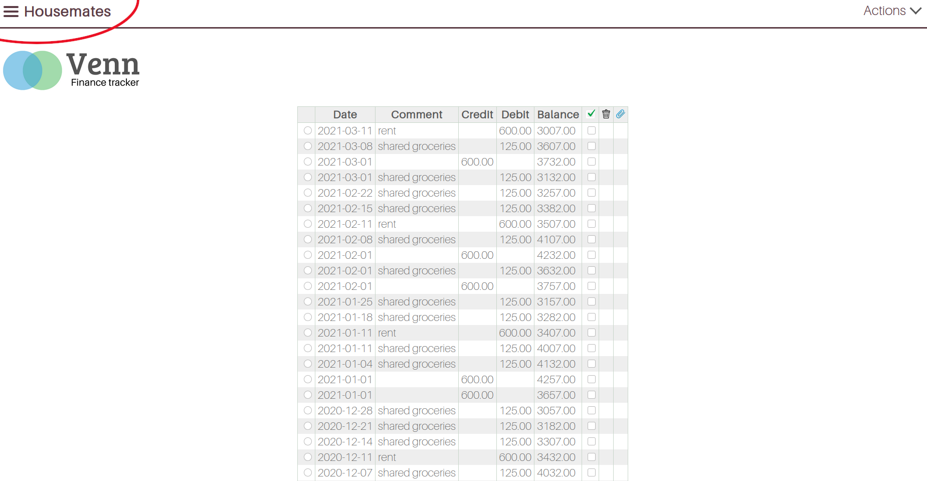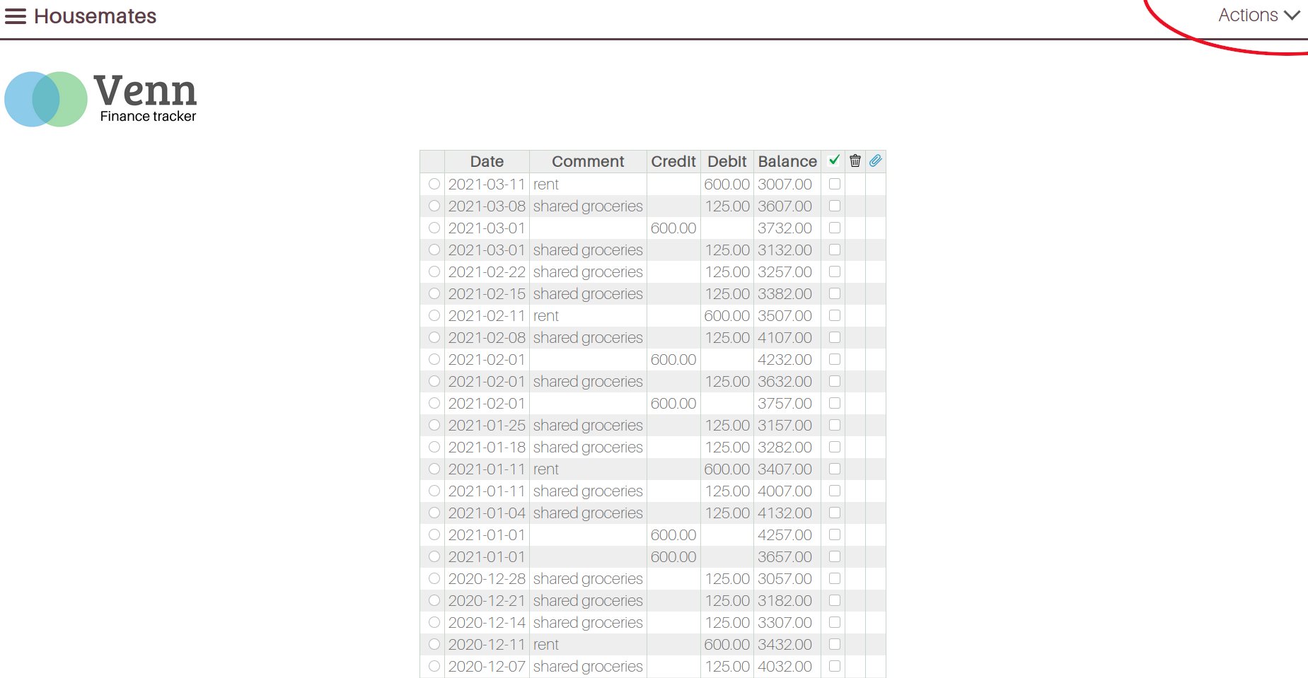 Each screen has its own set of associated actions (add, edit, delete, share etc), which can be found under the ‘Actions’ menu at the top right.